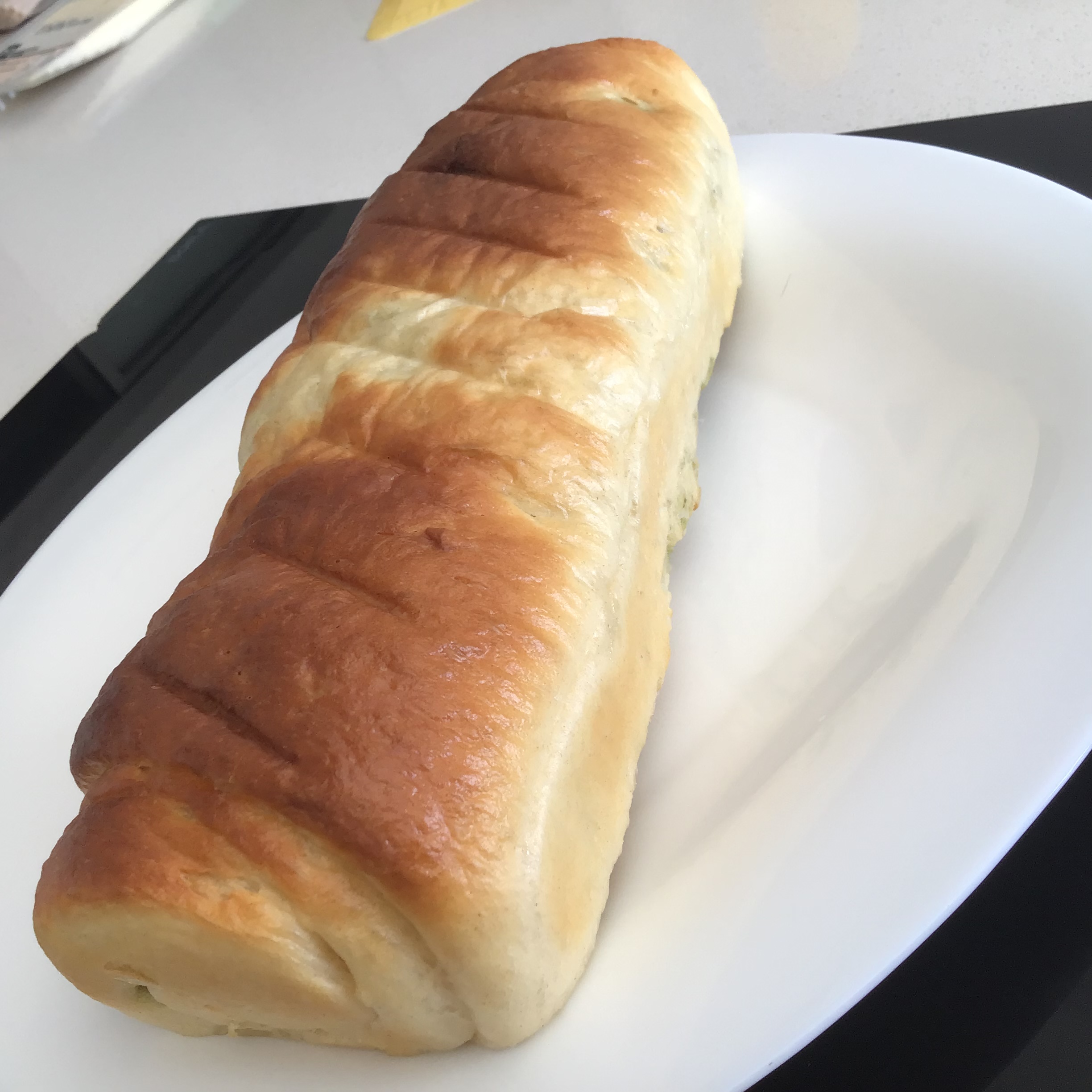 Con el rodillo, extienda la masa blanca hasta obtener un rectángulo de aprox. 18x30 cm. Extienda también la masa verde hasta obtener un rectángulo del mismo tamaño. Pincele la masa blanca con leche y coloque encima la masa verde. Enrolle las dos masas por la parte más corta, como si fuese un brazo de gitano apretando bien. Coloque el rollo en un molde de cake de 1 litro de capacidad (que quepa en el recipiente Varoma) previamente untado con mantequilla y pincele la superficie con leche.