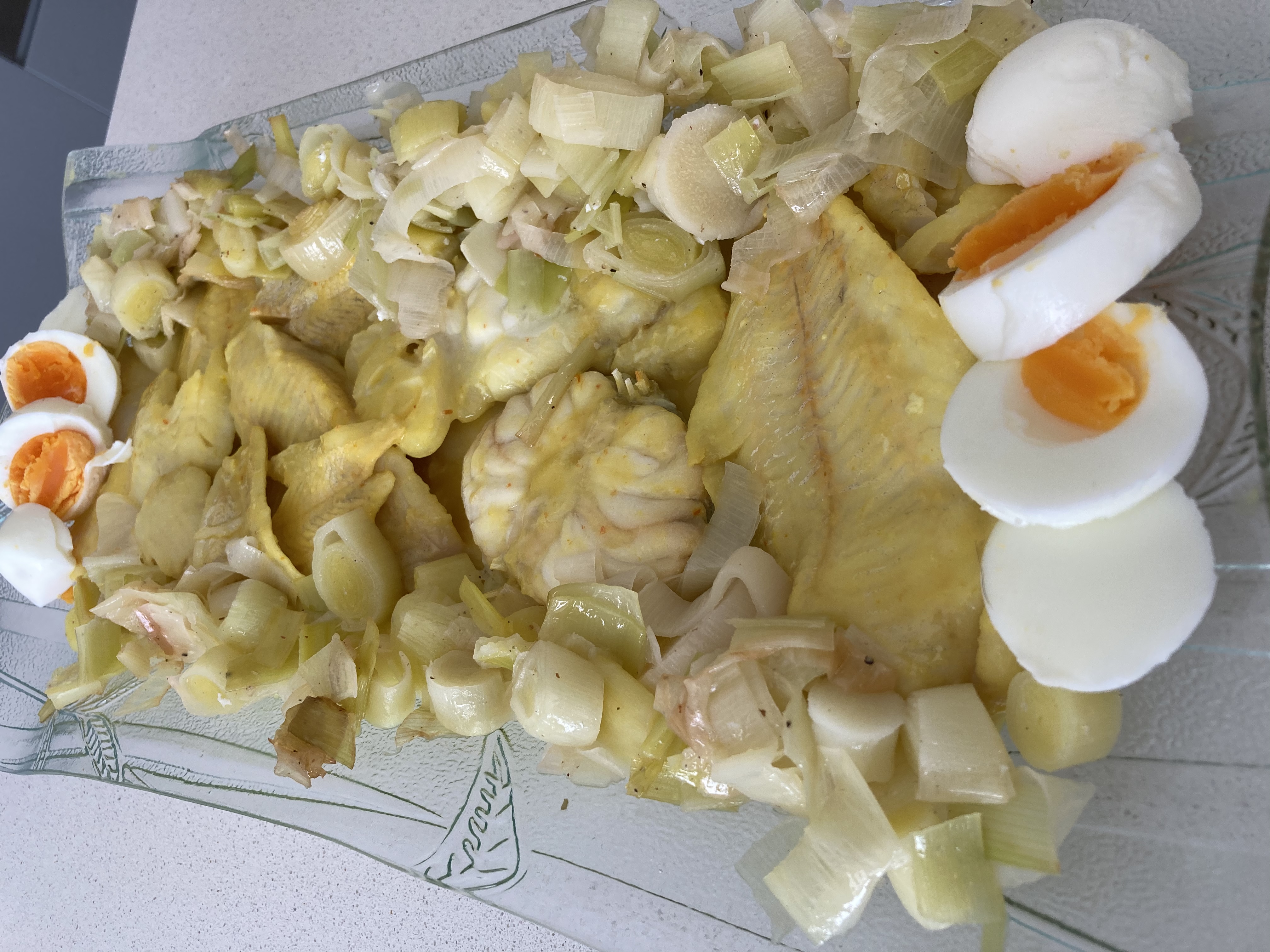 Hornee durante 5 minutos (180°C). Al mismo tiempo, caliente en una sartén la mantequilla y dore los puerros espolvoreados con 2 pellizcos de sal y pimienta. Sirva el rape con su salsa acompañado con rodajas de puerro y de huevo duro.
