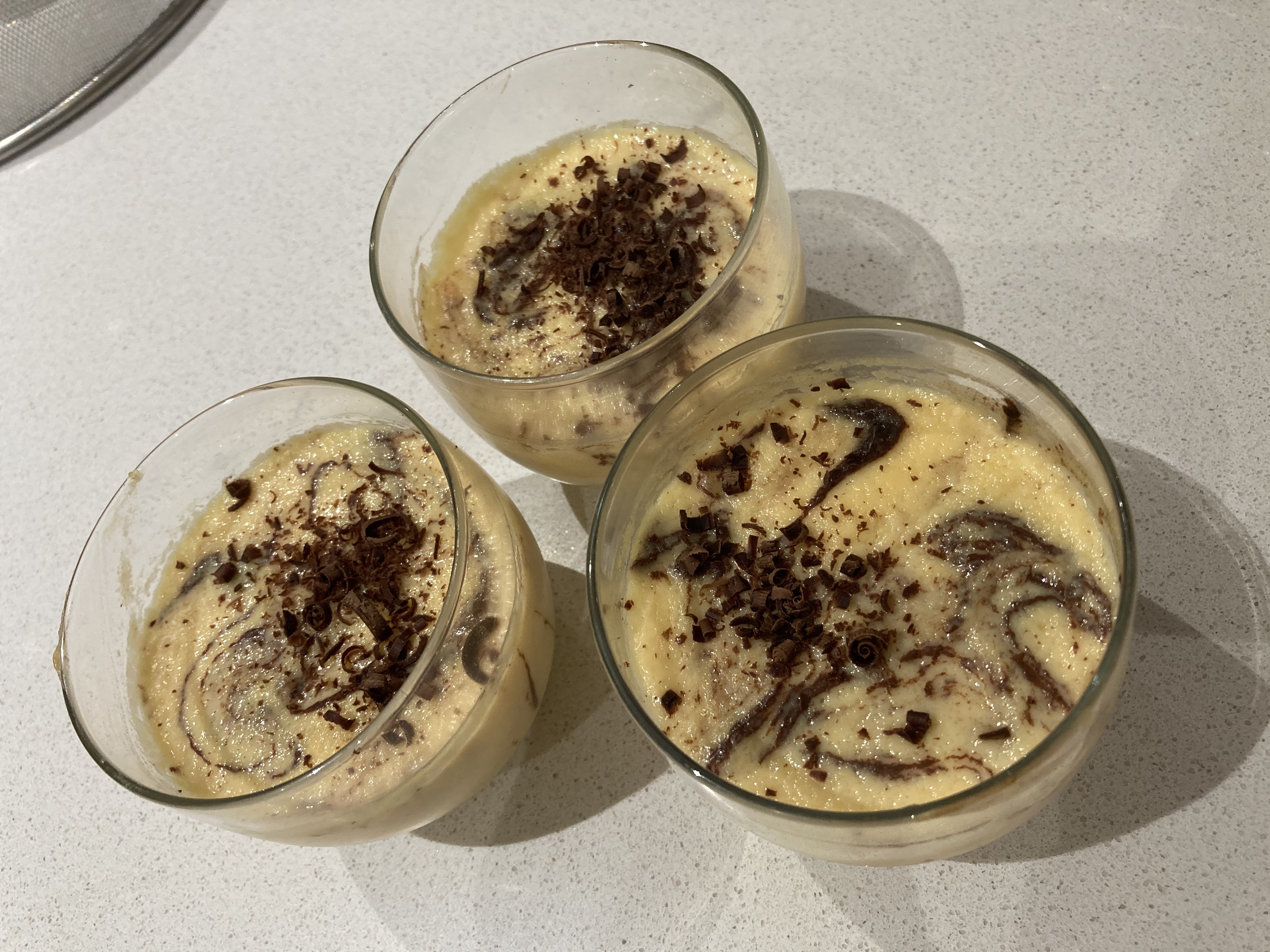 Retire la mariposa y la piel de naranja. Coloque una cucharadita de virutas de chocolate en cada cuenco donde vaya a servir el postre y vierta encima el contenido del vaso, mezcle suavemente con un tenedor para provocar un efecto “marmolado” o jaspeado. Deje enfriar y decore con el chocolate restante la superficie de los cuencos. Sirva.