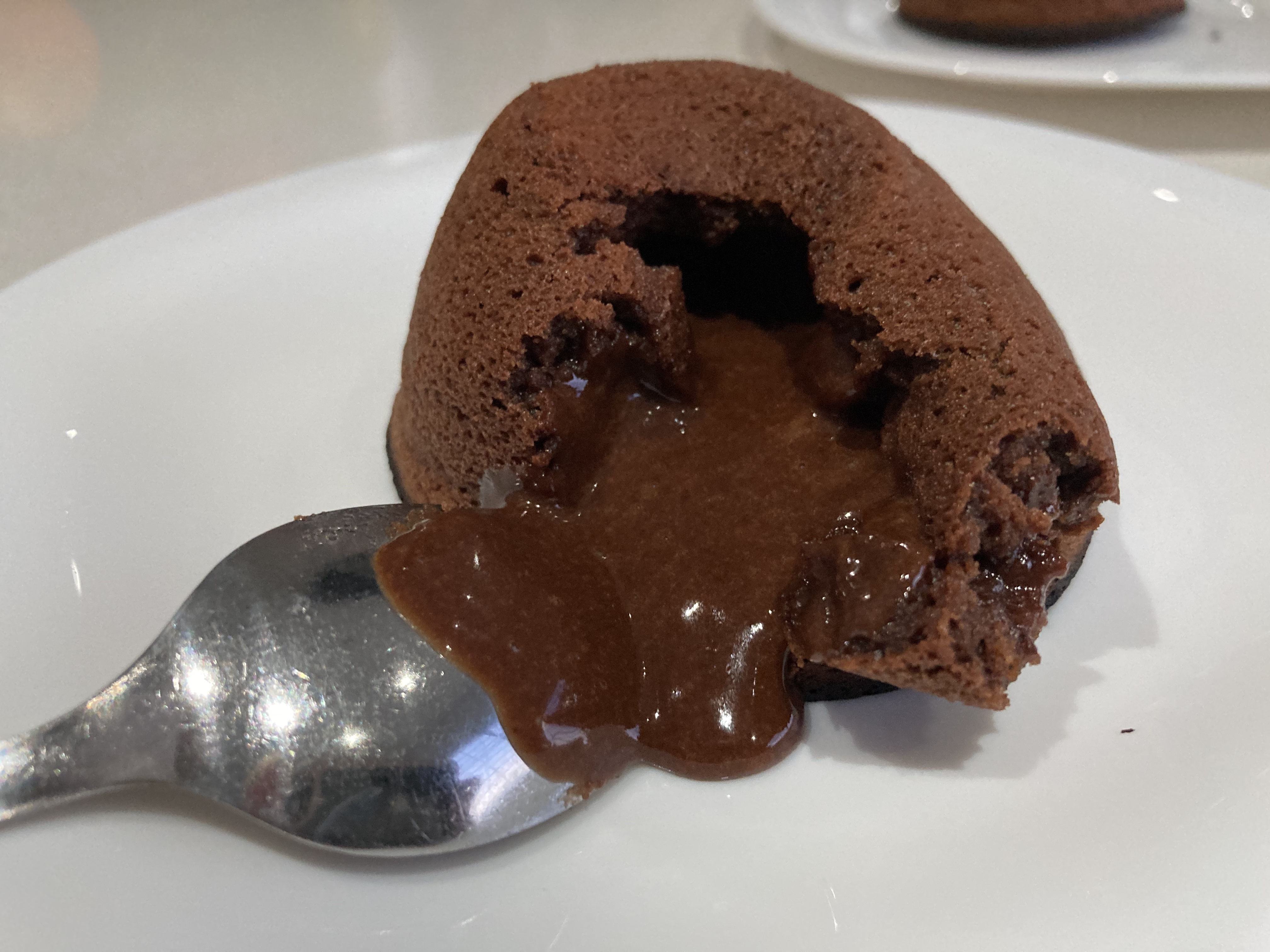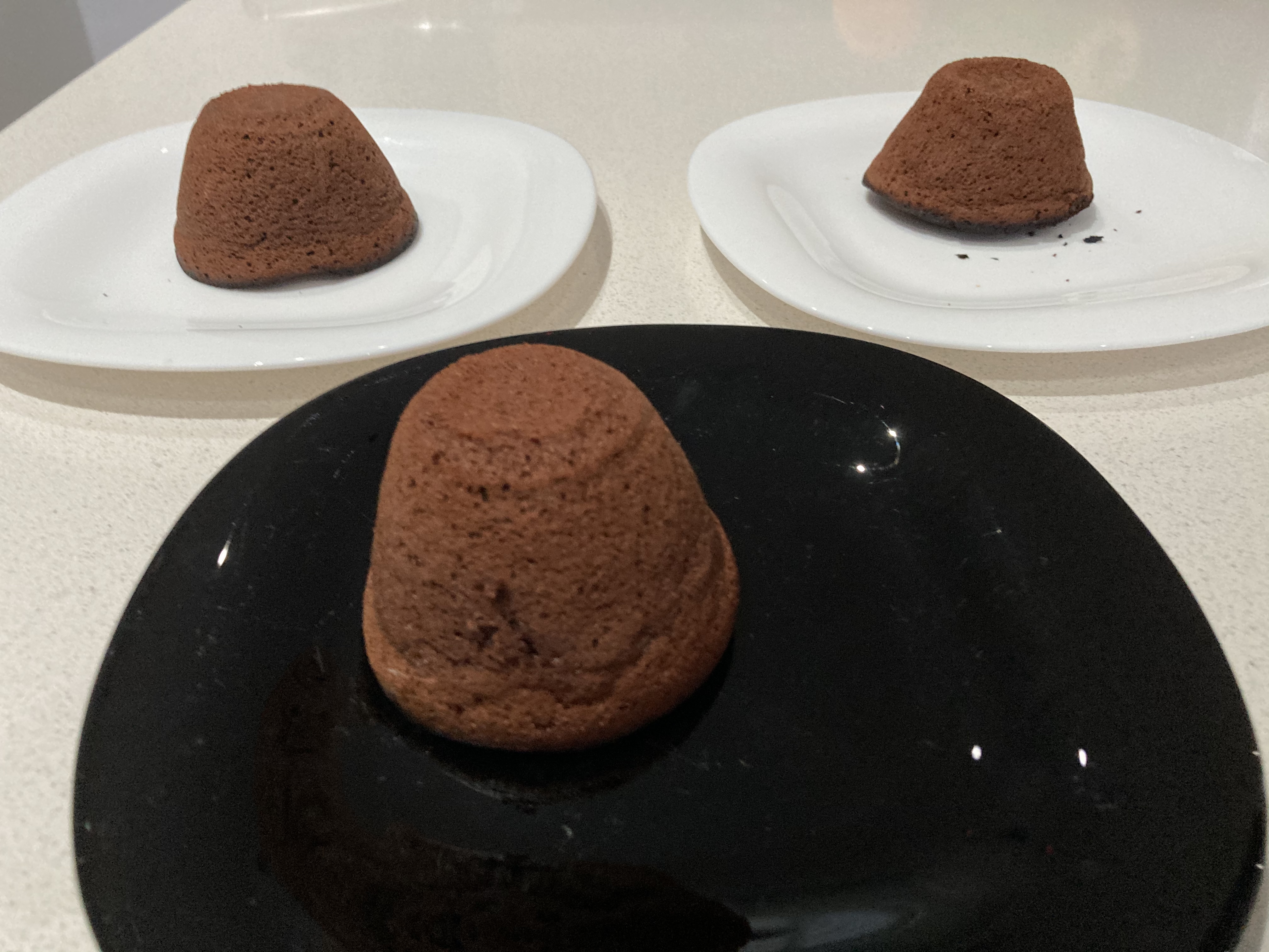 Vierta la mezcla en los moldes preparados. Hornee durante 7 minutos (240ºC). Retire del horno, desmolde y sirva inmediatamente. Tiene que quedar hecho por fuera y el chocolate fundido por dentro.