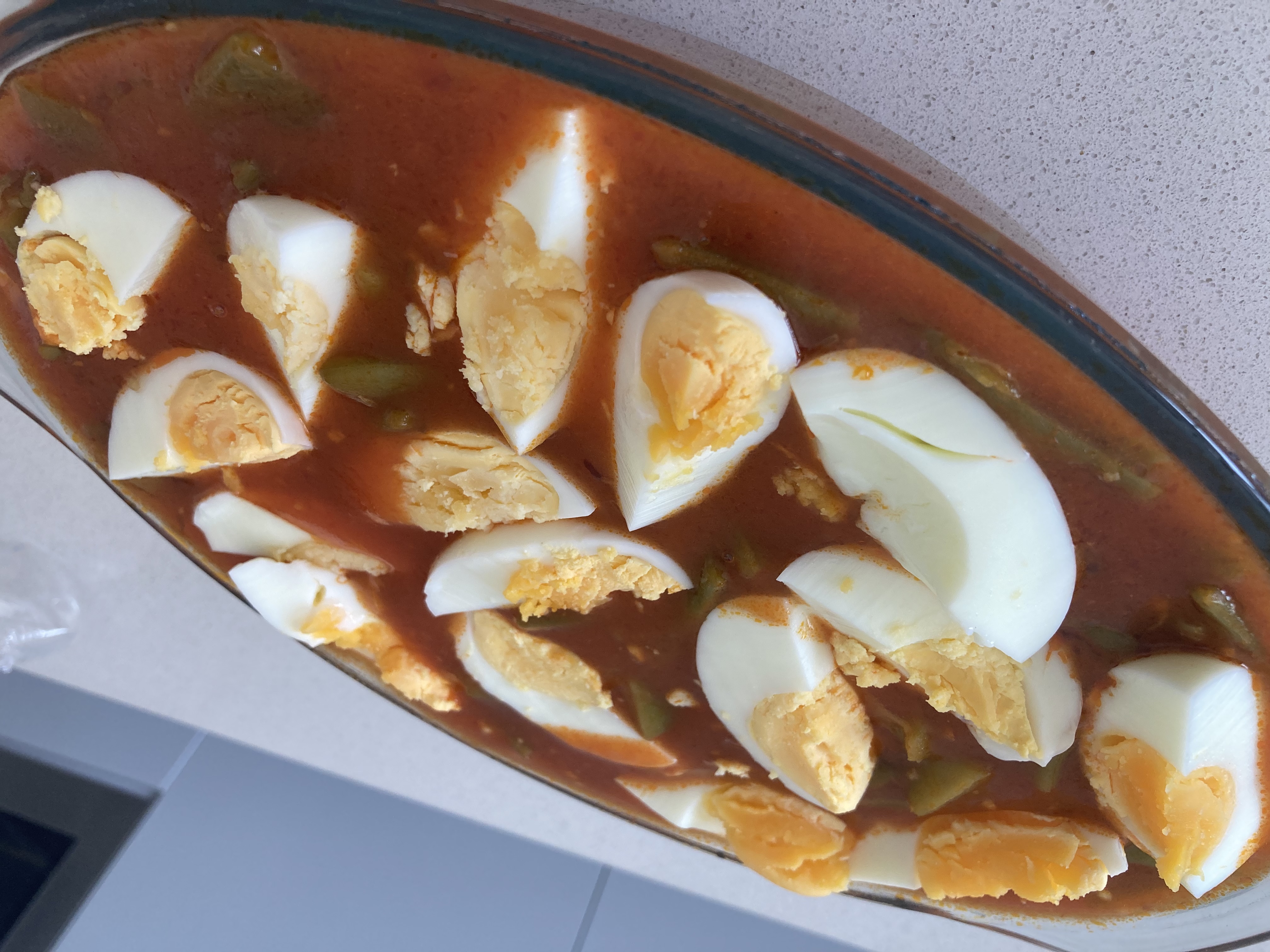 Ponga en el vaso el tomate triturado, la sal y el azúcar. Sitúe el recipiente Varoma en su posición. Ponga dentro los huevos y reparta las judías verdes alrededor, tape y programe 25 min/Varoma/vel 2. Retire el Varoma y ponga los huevos en un bol con agua fría.