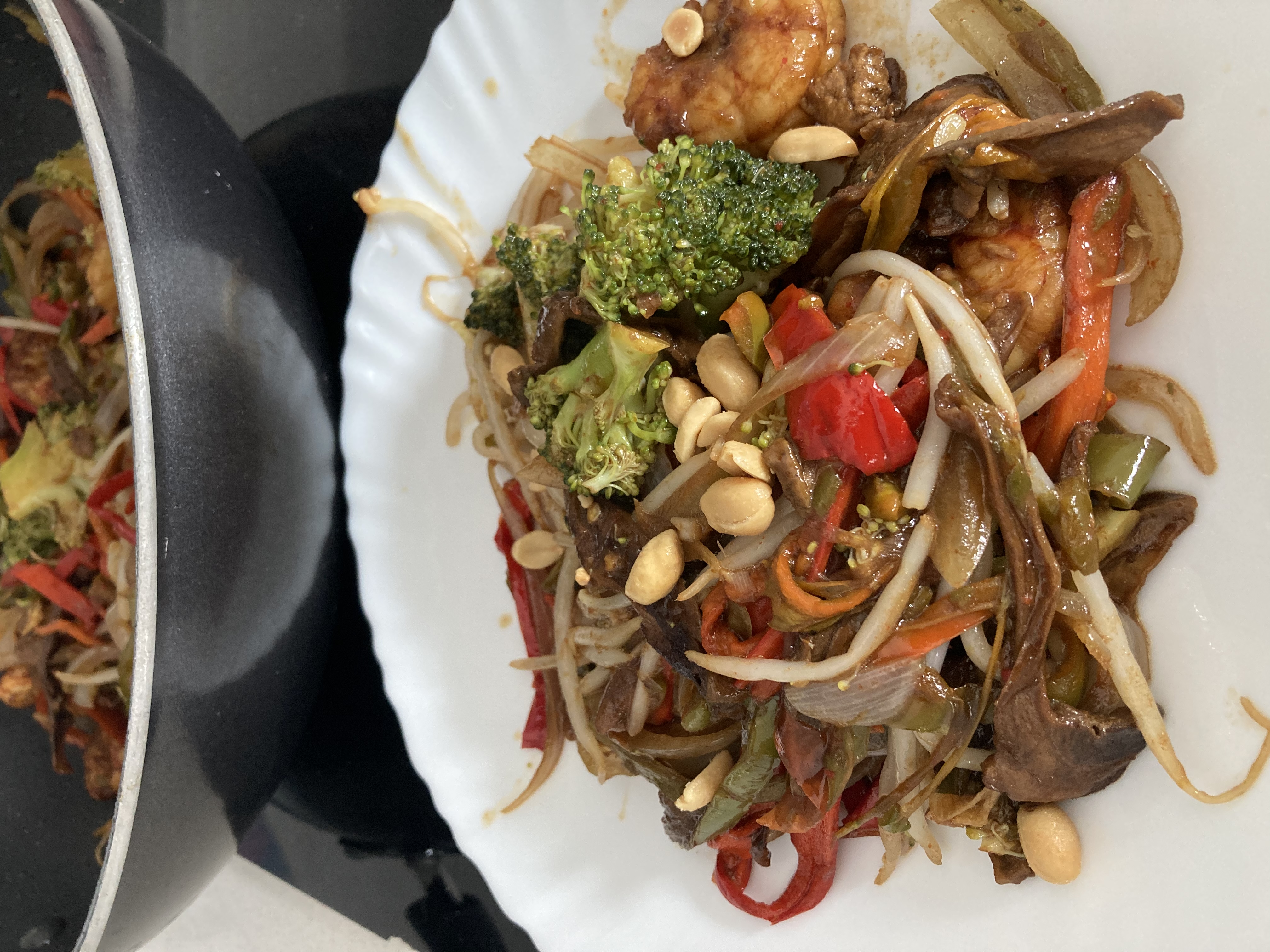 Caliente el aceite en una sartén grande y, a fuego muy fuerte, dore ligeramente los gambones marinados. Añada a la sartén las verduras del Varoma y las setas shiitake del cestillo y saltee 2-3 minutos. Vierta la salsa del vaso y cocine 2 minutos más. Añada los brotes de soja, mezcle con la espátula y retire del fuego. Sirva inmediatamente espolvoreado con los cacahuetes fritos.