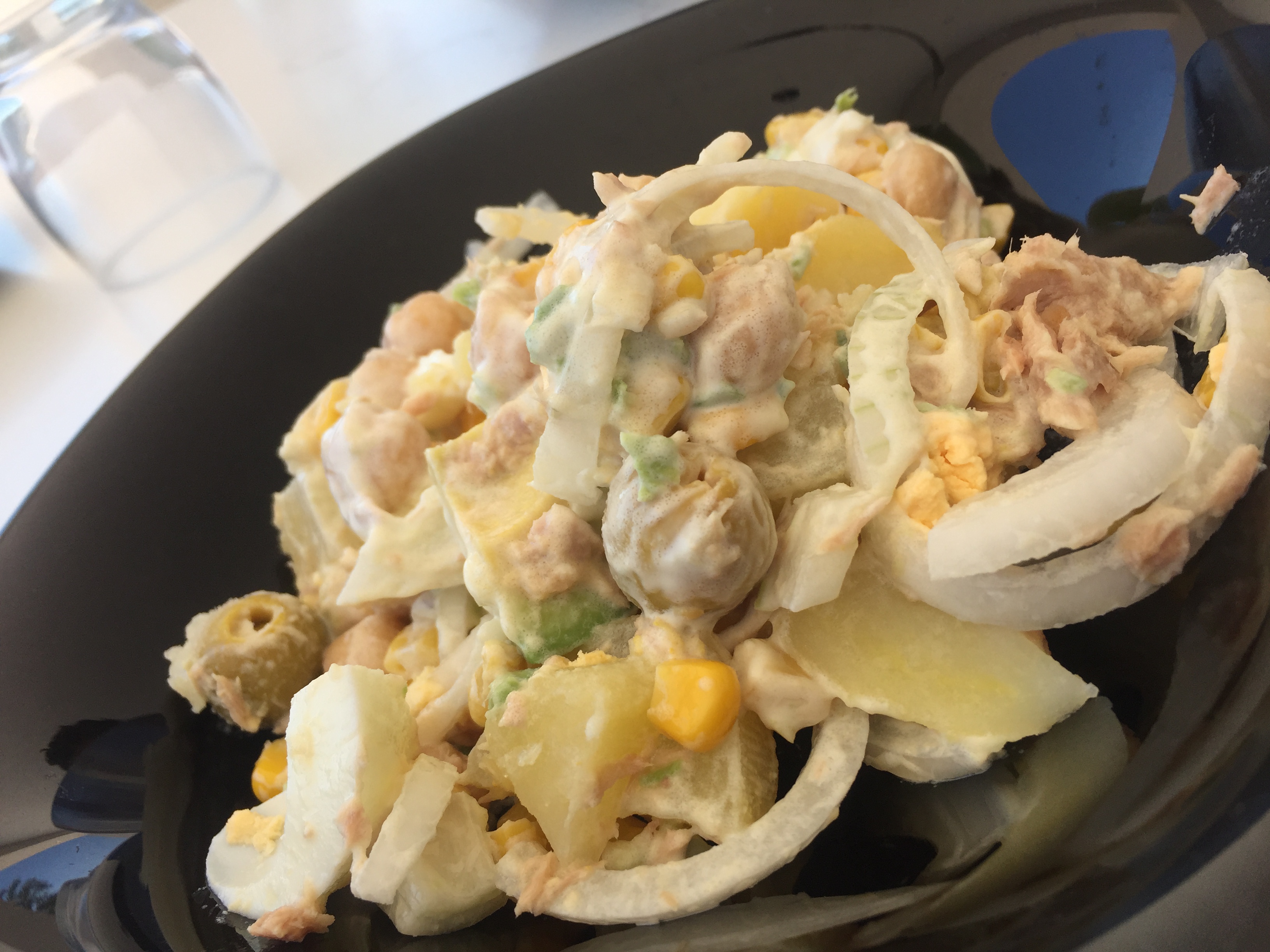 Ponga en el vaso el agua. Introduzca el cestillo con los huevos. Sitúe el recipiente Varoma en su posición con las patatas y programe 30 min/Varoma/vel Cuchara.Mientras tanto, ponga en una ensaladera los garbanzos cocidos, las cebolletas, 1 aguacate, el maíz, el atún, las aceitunas, los piquillos y la sal. Retire el Varoma. Con la muesca de la espátula, extraiga el cestillo y ponga los huevos en un bol con agua fría. Vierta las patatas en la ensaladera. Pele y corte los huevos en dados de 2-3 cm y añádalos a la ensaladera. Mezcle bien con la espátula y sirva con la mayonesa de aguacate.