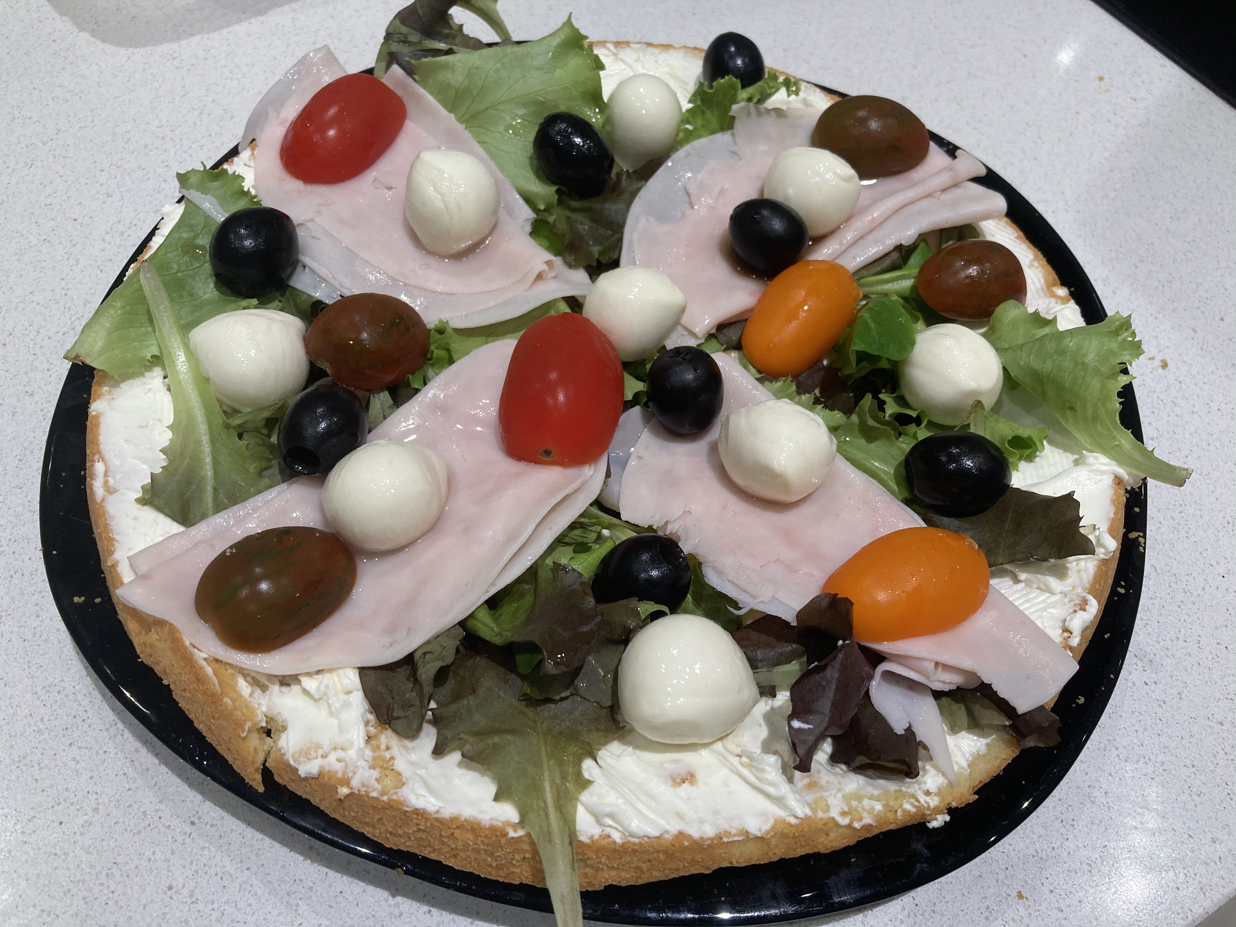 Hornee durante 20-25 minutos (180°C). Retire del horno y deje enfriar completamente. Desmolde boca abajo sobre un plato y unte la superficie con el queso cremoso. Decore con las hojas verdes de ensalada, el fiambre de pavo, la mozarella, los tomates cherrys y las aceitunas negras. Corte en porciones y sirva.