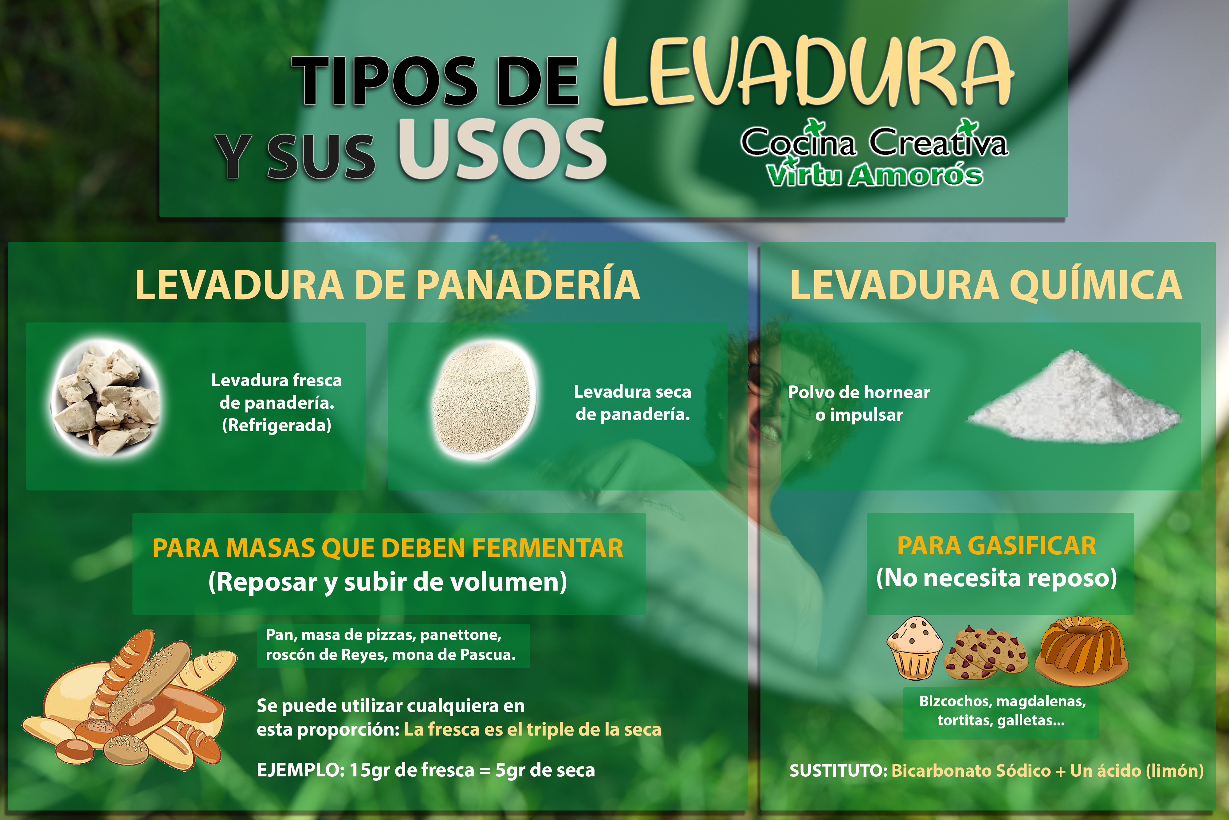 Hoy en Cocina Creativa Virtu Amorós, os vamos a explicar los tipos de levadura que existen y en que situaciones utilizarla ya que cada una de ellas sirve para diferentes elaboraciones.